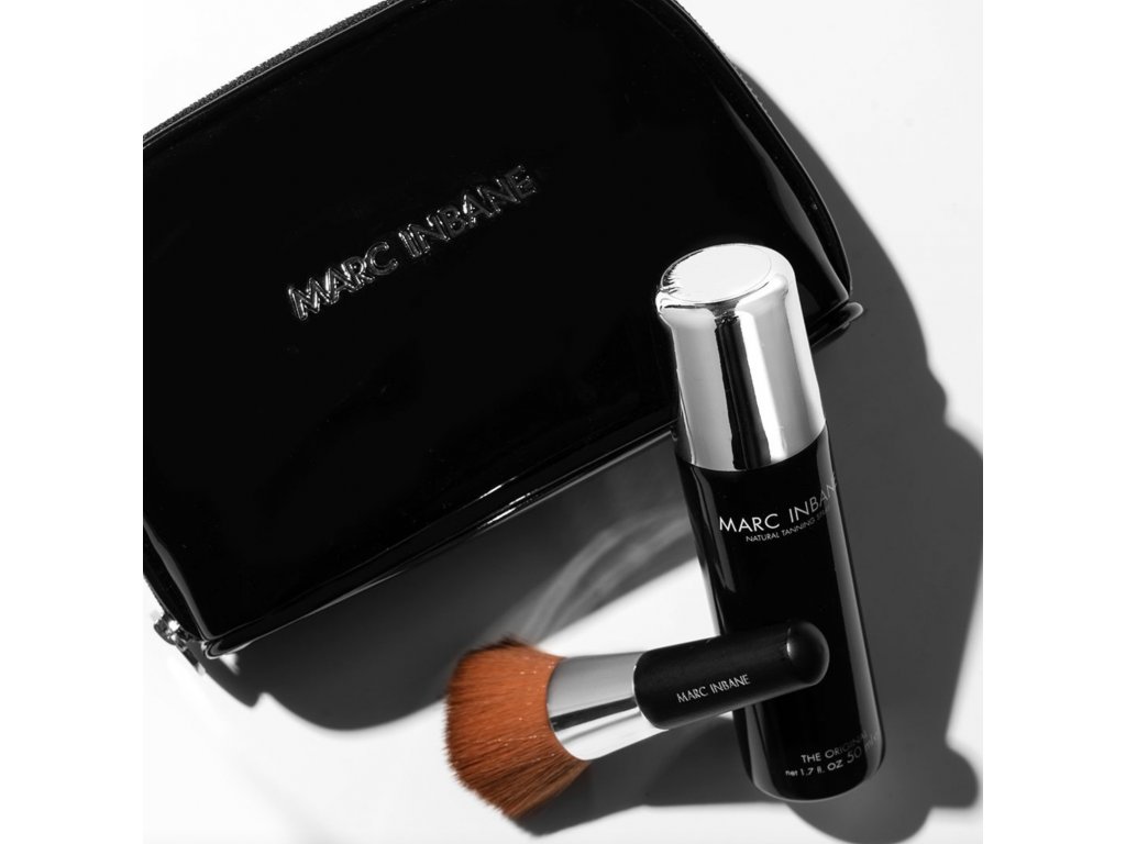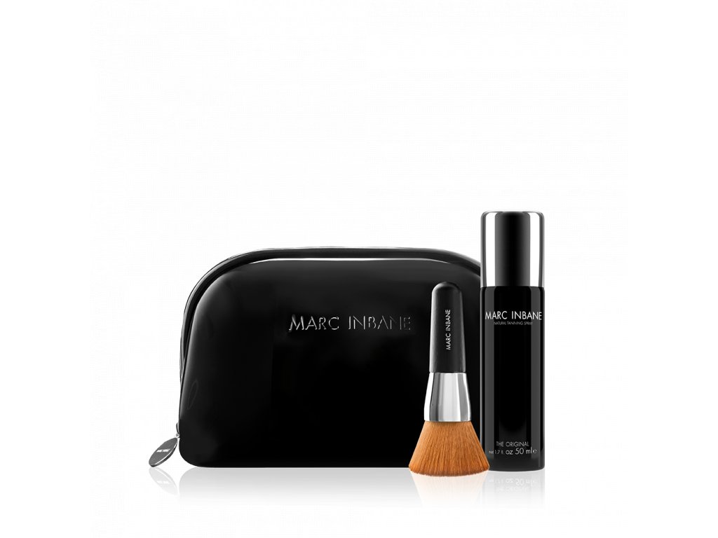 Cestovní set MARC INBANE obsahuje samoopalovací sprej 50ml + kabuki štětec a to vše v malé luxusní taštičce.